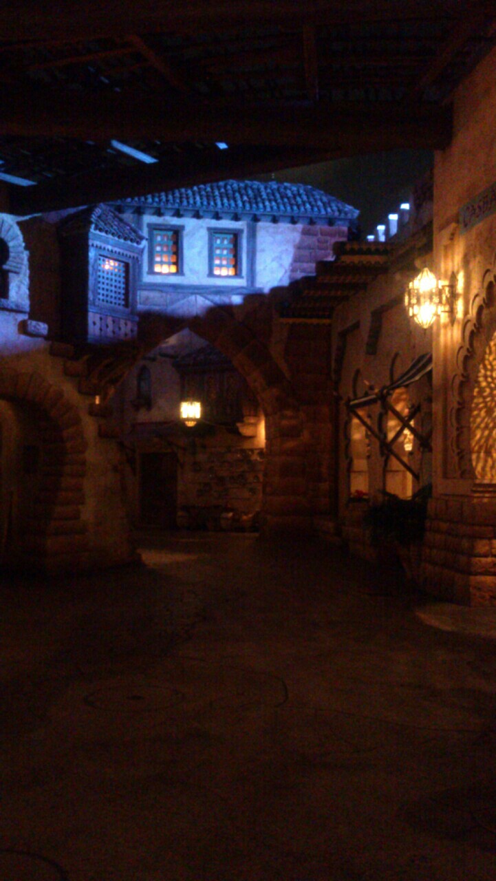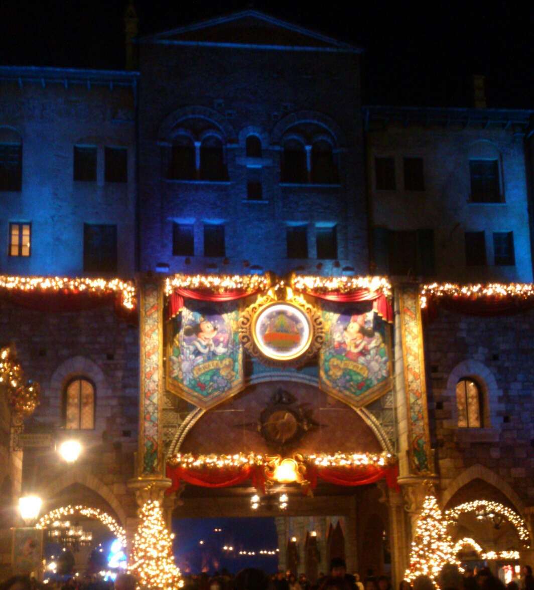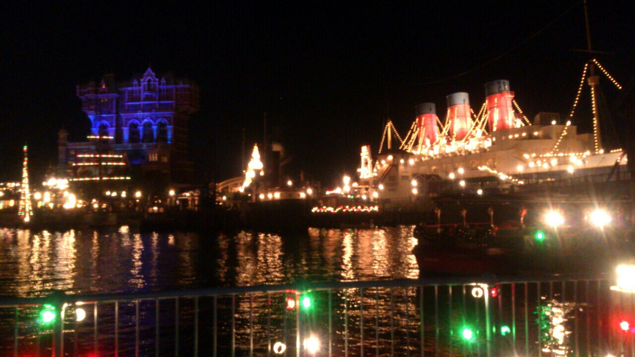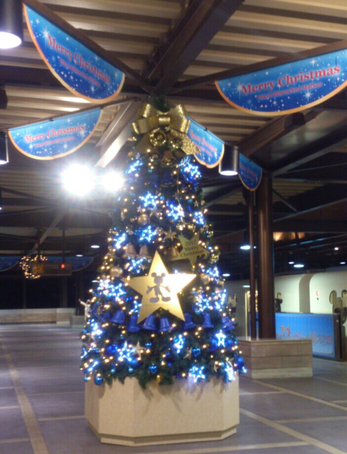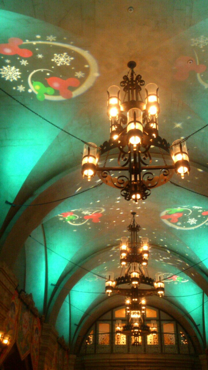 ダッフィーにグリしにいく途中で降りるの階段のそばのとこ。手前の緑のランプがクリスマスらしさをより伝えてくれます。