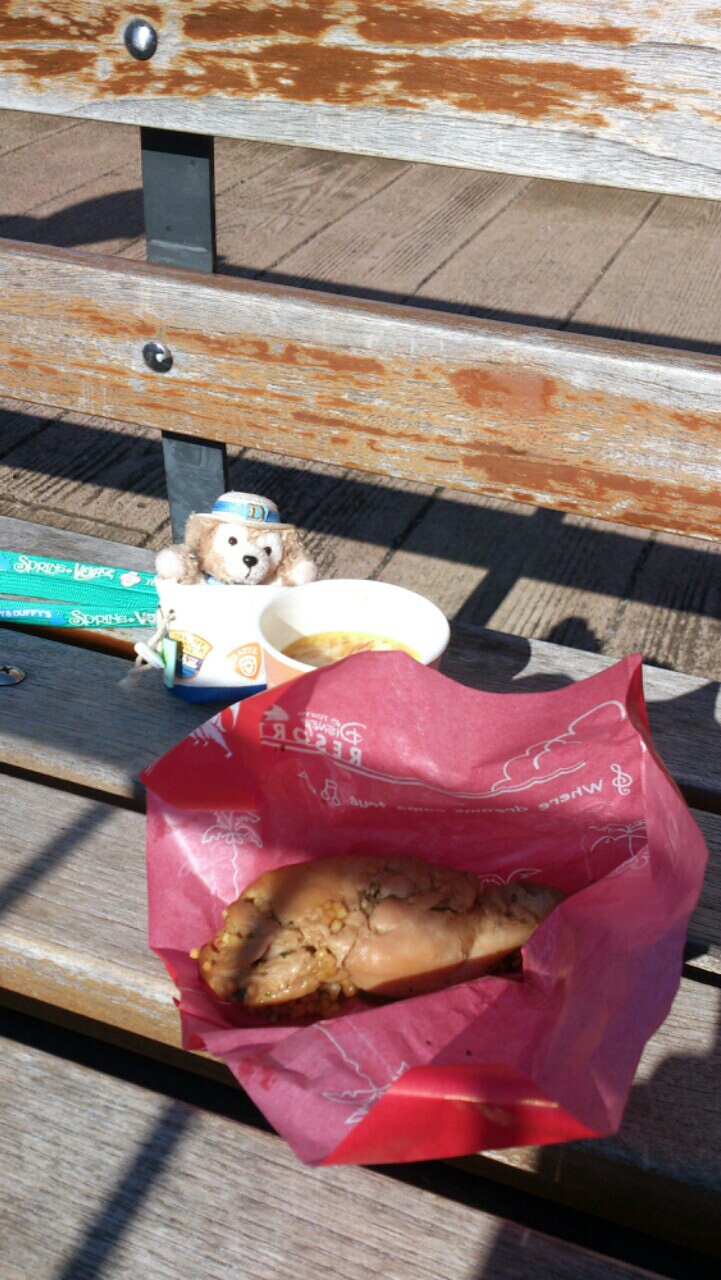 ショーをみたあとはレストラン櫻の側でみそクリームスープとあられチキンで一休み。