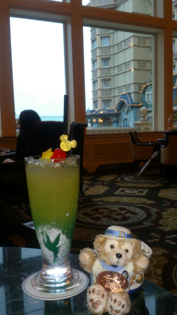 前回のお泊まりディズニーの時に得たメダルとともに。(あとで気づきましたが、奇しくもカクテルと同じティンカーベルの柄です!)