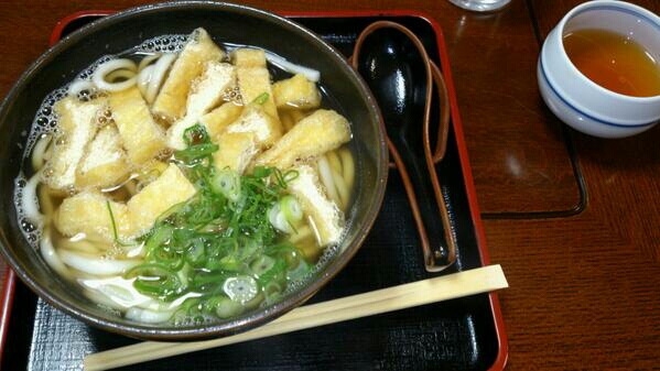 それから日の出うどんに辿り着きました。とてもお腹が空いていたんです。嬉しいね。相方は「カレーわかめうどん」みたいのを食べてました。私はおあげうどんにしました。